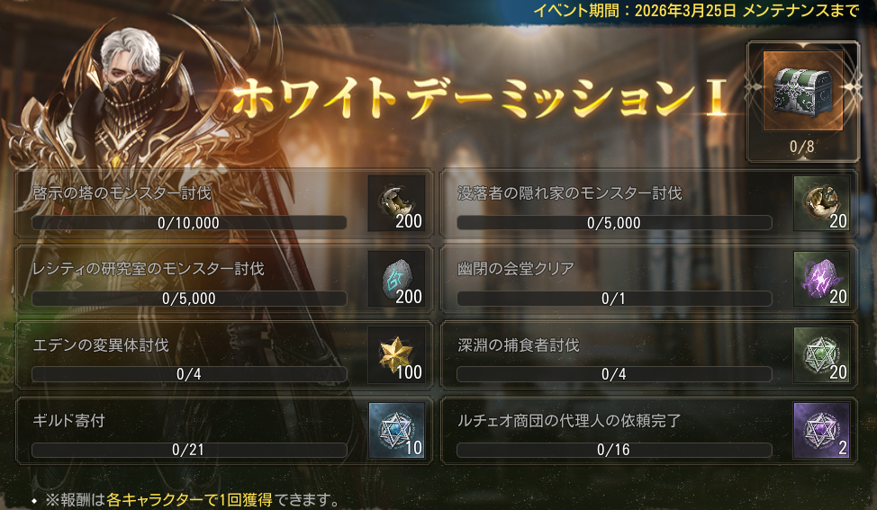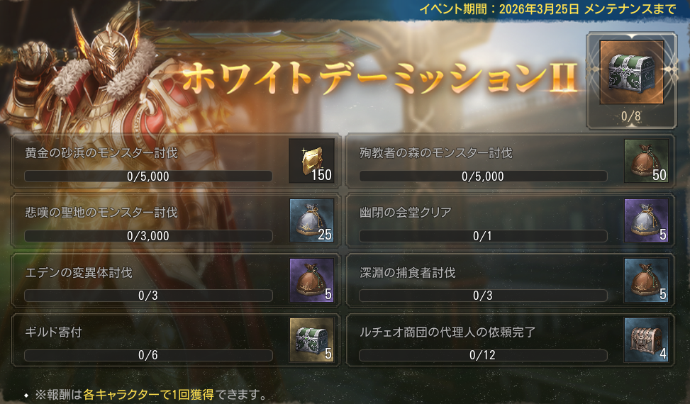 | 全インターサーバーで最初に「サリエル」討伐 | 該当インターサーバーのプレイヤー全員 | 特級古代防具選択ボックス(キャラ帰属) | 1 |
