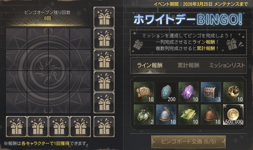 ・50,000ゴールドでビンゴボードを5回までリセットできます。